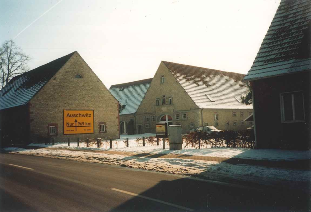 Das zwei mal drei Meter große Schild mit der Aufschrift „Auschwitz, nur 969 km – nie wieder“ von Pier van Djjk war 1995 im Rahmen der Kunstaktion „50 Jahre Befreiung vom Faschismus“ angebracht worden und hing als Monument gegen Faschismus und Gewaltherrschaft zwölf Jahre lang an der Außenwand des Künstler*dorfs.