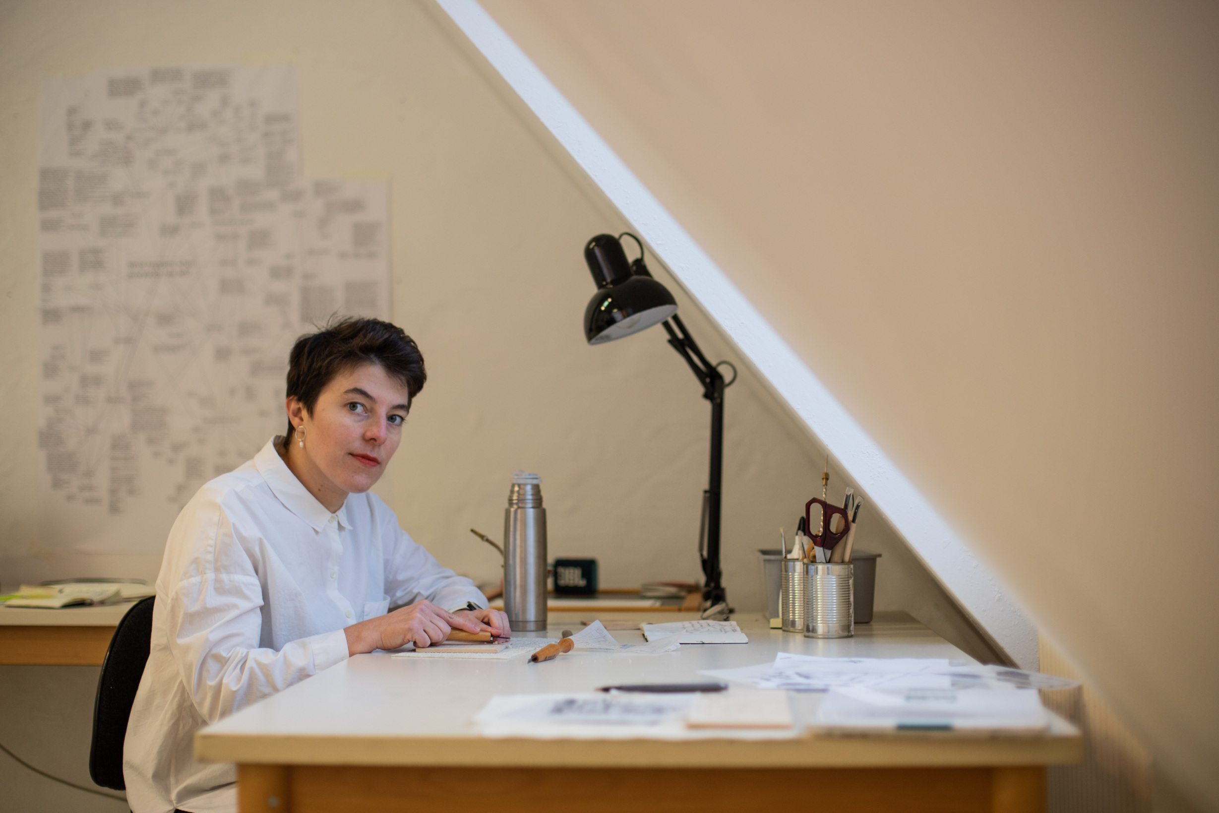 Während meines Stipendiums im Künstlerdorf Schöppingen habe ich ein langfristiges Grafikkunst¬-Projekt begonnen. Ich habe mit Liebesbriefen gearbeitet, die zwischen meiner Gro߬mutter und meinem Großvater von 1947 bis 1952 ausgetauscht wurden. Mit der Mokuhanga¬ Technik (Holzschnitt auf Wasser¬basis) versuche ich, den Text der Briefe in Bilder zu übersetzen. Jeder Druck zeigt ein Objekt, das von einer/m der beiden Kor¬respondentInnen benannt wurde. Die Sammlung der Drucke wird zu einer Bildkonstellation, die nebelhaft in Zusammenhang mit einem Brief stehen. Das Lesen der Drucke vermittelt Er¬fahrungen und Epochenporträts, die den BetrachterInnen eine of¬fene Interpretation ihres Lebens und ihrer Kontexte ermögli¬chen. Mit dieser Serie möchte ich den Nachhall der Übersetzung frei¬legen, den Text, der durch das Druckverfahren zum Bild und wieder zu einer Erzählung wird.
