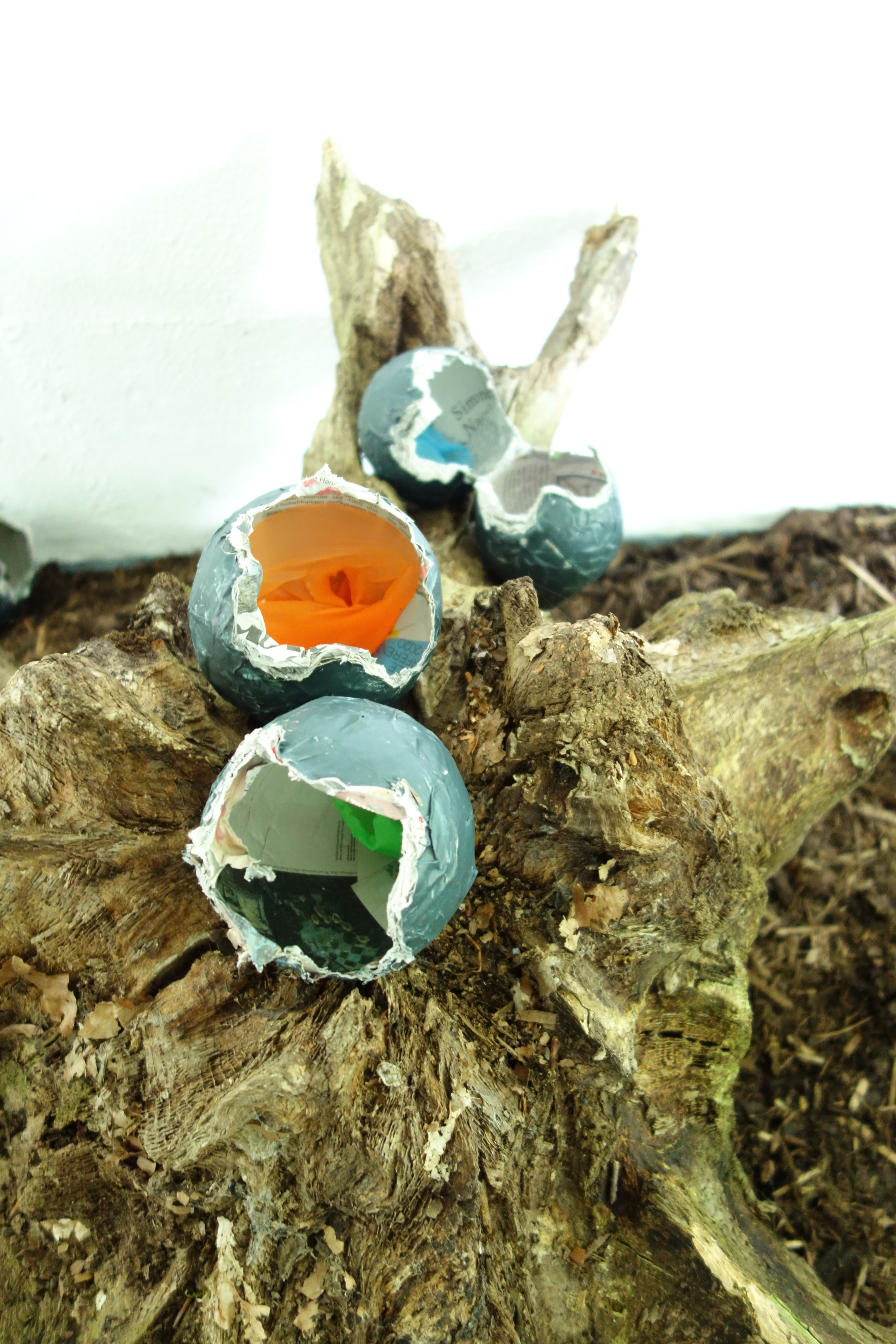 Vor Ort entdeckte Pia die Spannung, die im Papier selbst steckt und begann mit dem Erkunden von Kreislauf- und Wachstumsprozessen – Mondphasen, mineralischem Wachstum, Eiern und (Wespen-)nestern – mittels Papier. Dem Experiment folgend, schöpfte sie vielfältige dreidimensionale Arbeiten welche diese Qualitäten des Materials verkörperten. Als Abschlusspräsentation in der Ausstellungshalle kombinierte sie die Objekte mit Fundstücken und natürlichem Material wie Mulch und Geäst, was die Objekte zur raumgreifenden Installation überführte.